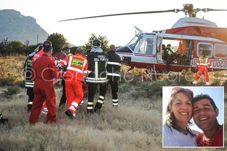 Il trasporto dei feriti in elicottero e nel riquadro Checco Puggioni e Isabella Saba, le vittime