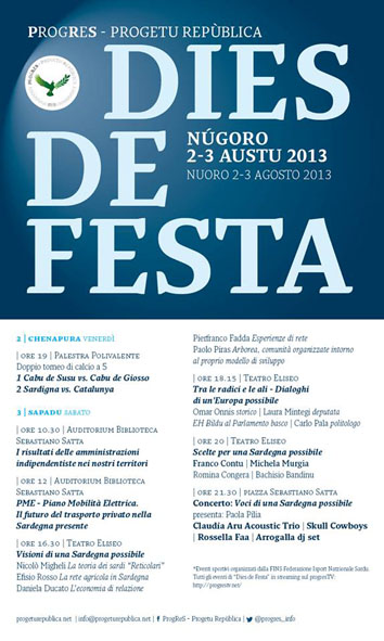 ProgReS – Progetu Repùblica inaugura oggi la due giorni Dies de Festa 2013, appuntamento itinerante estivo dedicato a incontri politici, culturali, sportivi e musicali organizzato che quest’anno vedrà protagonista la città di Nuoro.