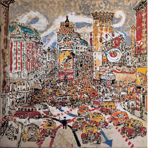 Un taxi giallo in pedana, una cartina di New York sullo sfondo per raccontare la storia di Costantino Nivola, l’artista e scultore sardo che, sposato a una tedesca di origine ebraica, fu costretto dalle persecuzioni antisemite ad abbandonare l’Italia, rifugiandosi prima a Parigi, e poi, dopo l’invasione nazista della Francia, a New York, dove strinse amicizia con artisti come Le Corbusier, Pollock, Saul Steinberg.