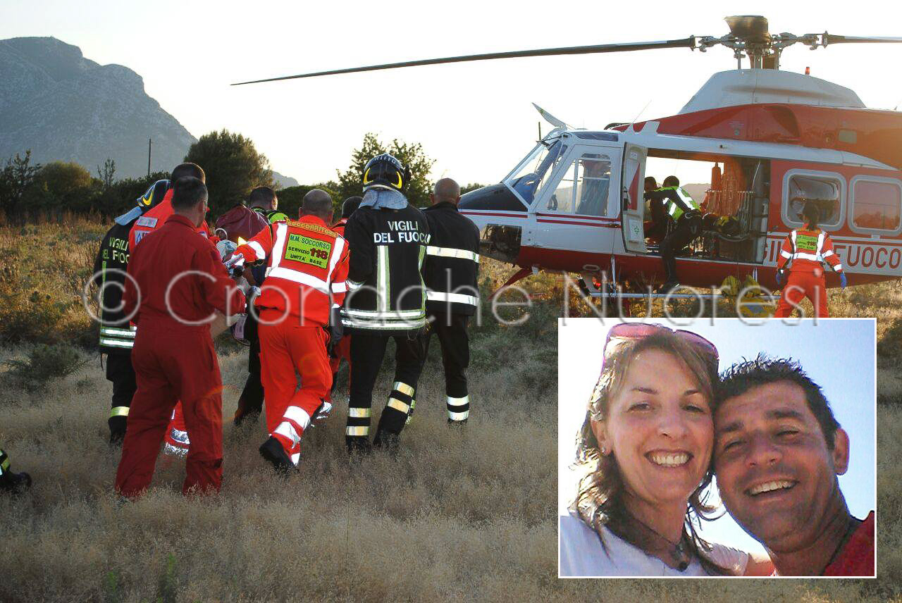 Il trasporto dei feriti in elicottero e nel riquadro Checco Puggioni e Isabella Saba, le vittime