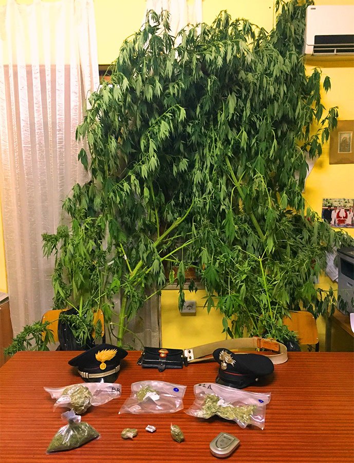 Durante la perquisizione i Carabinieri hanno rinvenuto vari involucri trasparenti sottovuoto contenenti marijuana per un ammontare complessivo di 340 grammi circa; un pezzo di hashish del peso di 2,5 grammi; un trita erba con frammenti di marijuana; un bilancino di precisione; due piante di marijuana dell’altezza di circa tre metri; quattro piante di marijuana dell’altezza di circa un metro.