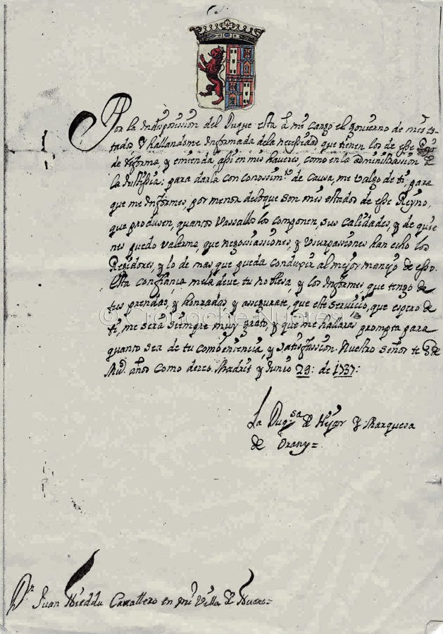 In sintesi, la Marchesa di Orani scriveva da Madrid il 29 Giugno del 1737 al suo fiduciario amministratore, Cav. Don Giovanni Nieddu della villa di Nuoro, per conto del Duca suo marito, al momento indisposto.  Nel documento comunicava di essere la responsabile del feudo, e avvalendosi della collaborazione del Nieddu, la Marchesa chiedeva di essere informata sullo stato del suo territorio feudale, cosa questo produceva e nonché la consistenza numerica dei vassalli e le loro qualità.