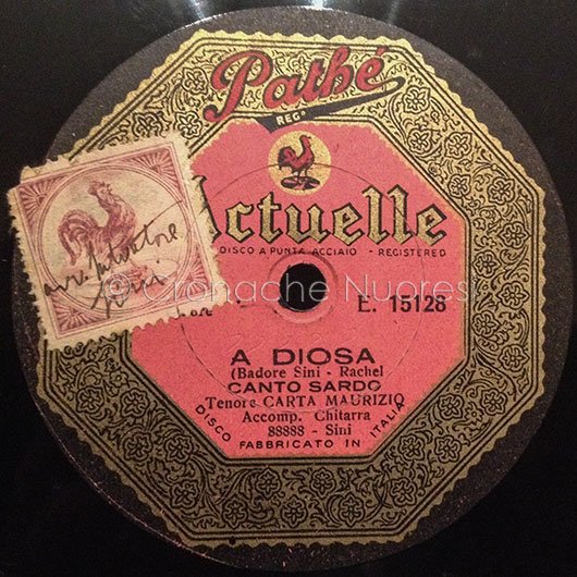 A Diosa, anno 1930 cantata da Maurizio Carta, incisione su disco Pathé Actuelle. Si tratta dell’incisione “storica” della più vecchia versione su disco. L’interprete è il tenore lirico Maurizio Carta di Mogoro. Nato nel 1904 da famiglia della media borghesia (il padre era Cancelliere di Tribunale), sin da giovane il cantante dimostrò grandi doti vocali, tanto da destare interesse da parte del direttore della casa discografica Paté, che udendolo cantare nel corso di una serata musicale, nel 1928 gli propose un’incisione discografica. Fu quella la prima di una serie di fortunate incisioni che con discreto successo furono trasmesse dall’EIAR (l’emittente radiofonica di allora). La peculiarità di Maurizio Carta fu l’eclettismo della sua voce; non si limitava, infatti, alla sola esecuzione di brani tradizionali, ma si dilettava volentieri con l’esecuzione di arie e romanze operistiche. Ritenuto una delle più belle voci sarde del primo Novecento, tenne con successo vari concerti a Milano e a Roma. Fu protagonista del concerto inaugurale del Teatro “Del Carmine” di Tempio.