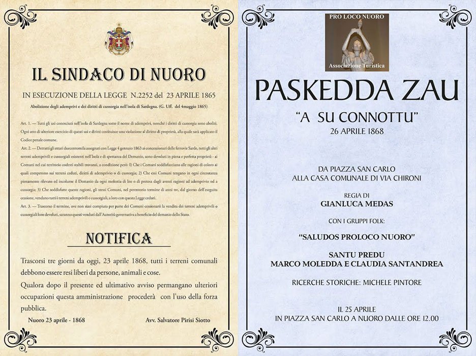 Un appuntamento a cui la città si prepara il prossimo martedì 25 aprile riproponendo lo storico evento con una grande rappresentazione nello storico rione di Santu Predu, nei luoghi dove si svolsero i fatti che si conclusero con la famosa sommossa popolare capeggiata da Paskedda Zau (divenuta figura simbolo di donna nuorese contro le oppressioni) che portò all’assalto della Casa Comunale che allora aveva sede nel Palazzo Martoni, ancora esistente nell’attuale via Chironi 5 (APPROFONDISCI).