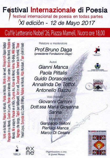 Dopo il grande successo ottenuto lo scorso anno con la Giornata Mondiale della Poesia, organizzata dal poeta nuorese Gianni Manca, Nuoro ospita il prossimo venerdì 12 maggio il Festival Internazionale di Poesia Festival Internacional de poesia en todas partes, giunto alla XI edizione, che si terrà alle ore 18 presso il Caffè Letterario Nobel ’26 dell’ExMé di Piazza Mameli.