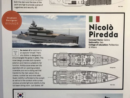 Piredda, 24 anni, ha impressionato i giudici «per lo stile pratico ed elegante del suo progetto “Galanà”»: splendida imbarcazione da 60 metri curata in ogni dettaglio e destinata ai gusti più esigenti.
