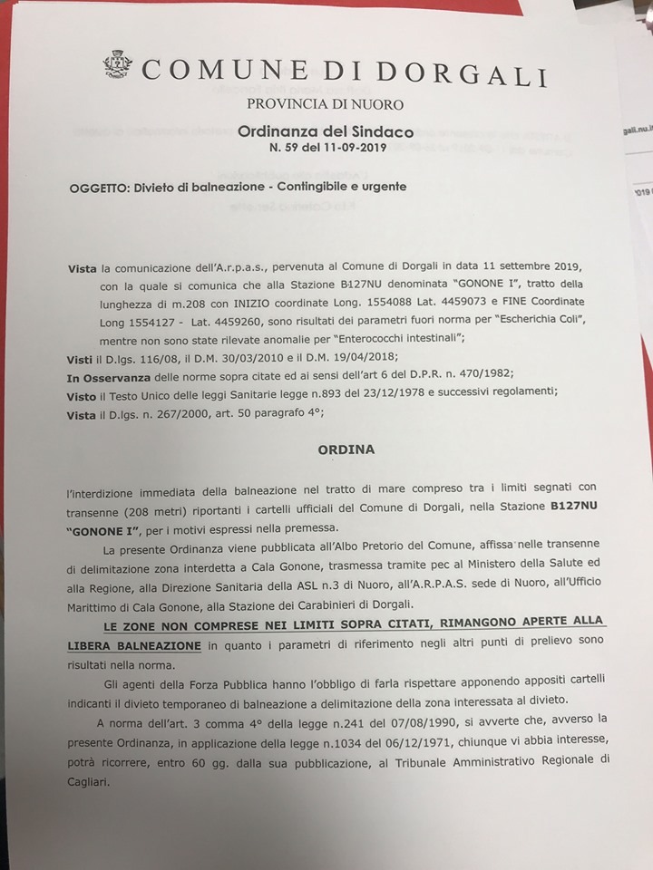 Il comune di Dorgali ha interdetto la balneazione nel tratto di mare antistante la spiaggia riservata ai cani a Palmasera e ha provveduto a delimitare l’area con apposite apposite transenne.