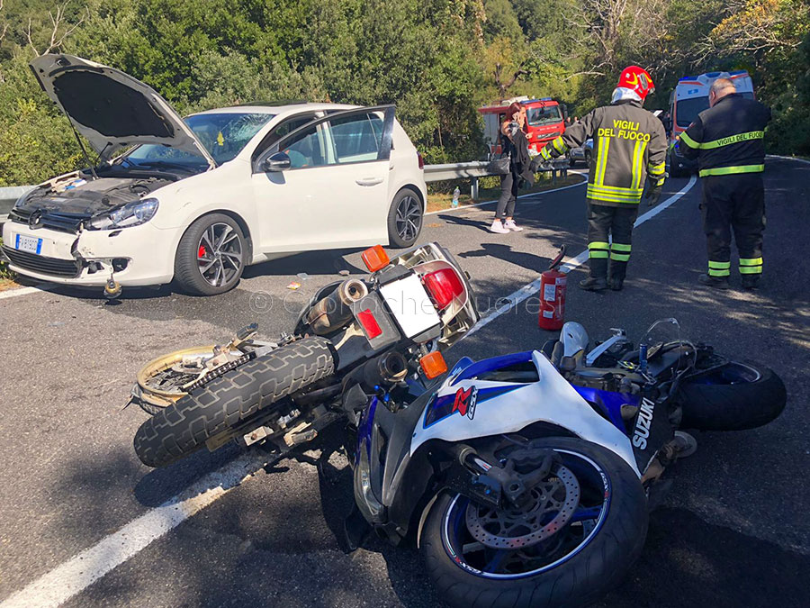 Ad avere la peggio uno dei due centauri mentre la passeggera che viaggiava sull’auto e l’altro motociclista sono rimasti feriti in maniera lieve.