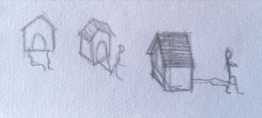 Nicola Mette rappresenta il proprio isolamento incatenato ad una casa che trascina forzatamente verso una libertà voluta da tutti.
