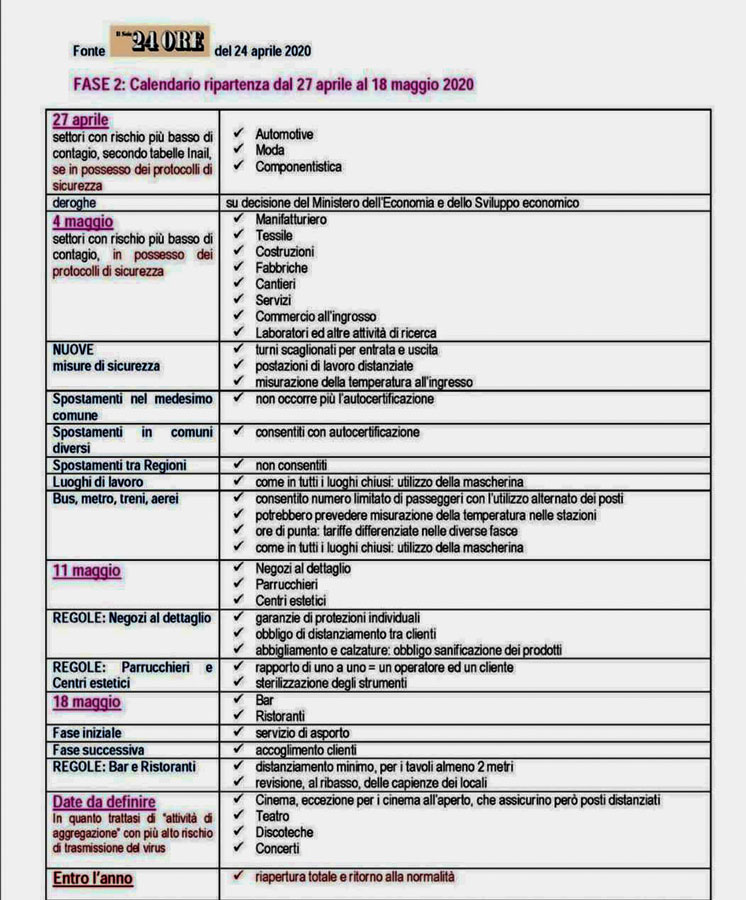 Oggi, nel giorno della Liberazione, il Governo dovrebbe finalmente definire in linea generale i dettagli della cosiddetta “Fase 2”, quella della graduale riapertura che si articolerà su 4 lunedì. Vediamo le possibili novità: cosa si potrà fare e cosa no.