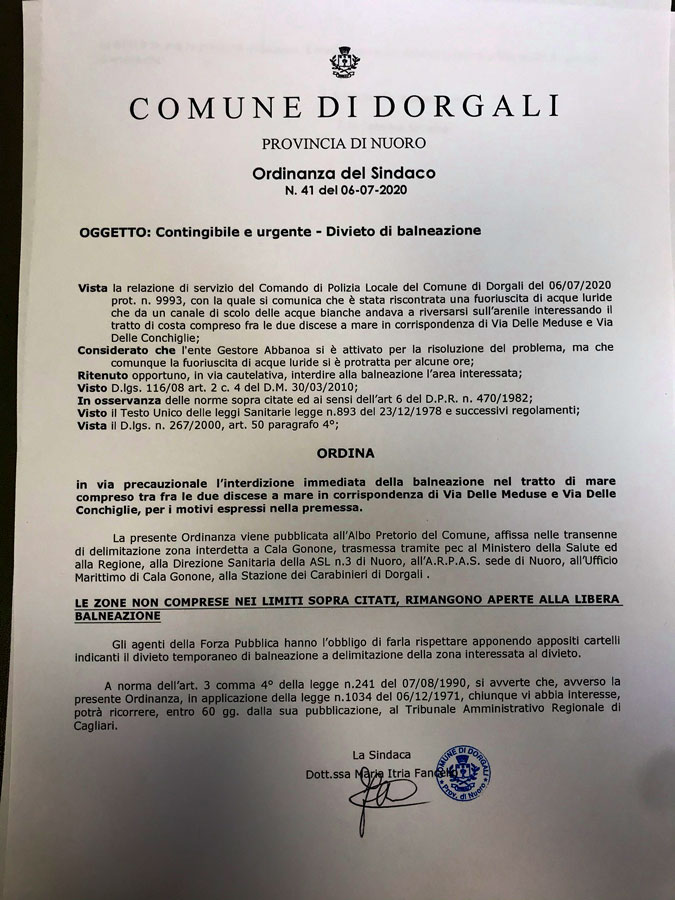 A pochi metri dalla spiaggia centrale di Cala Gonone ritorna il problema degli scarichi delle acque reflue a mare. Da lunedì scorso è presente un rigagnolo di acqua putrida in questo tratto di costa, un problema in piena stagione turistica, seppure depontaziata dall’emergenza Covid, che ha portato l’amministrazione Comunale di Dorgali ha disporre la chiusura in via precauzionale.