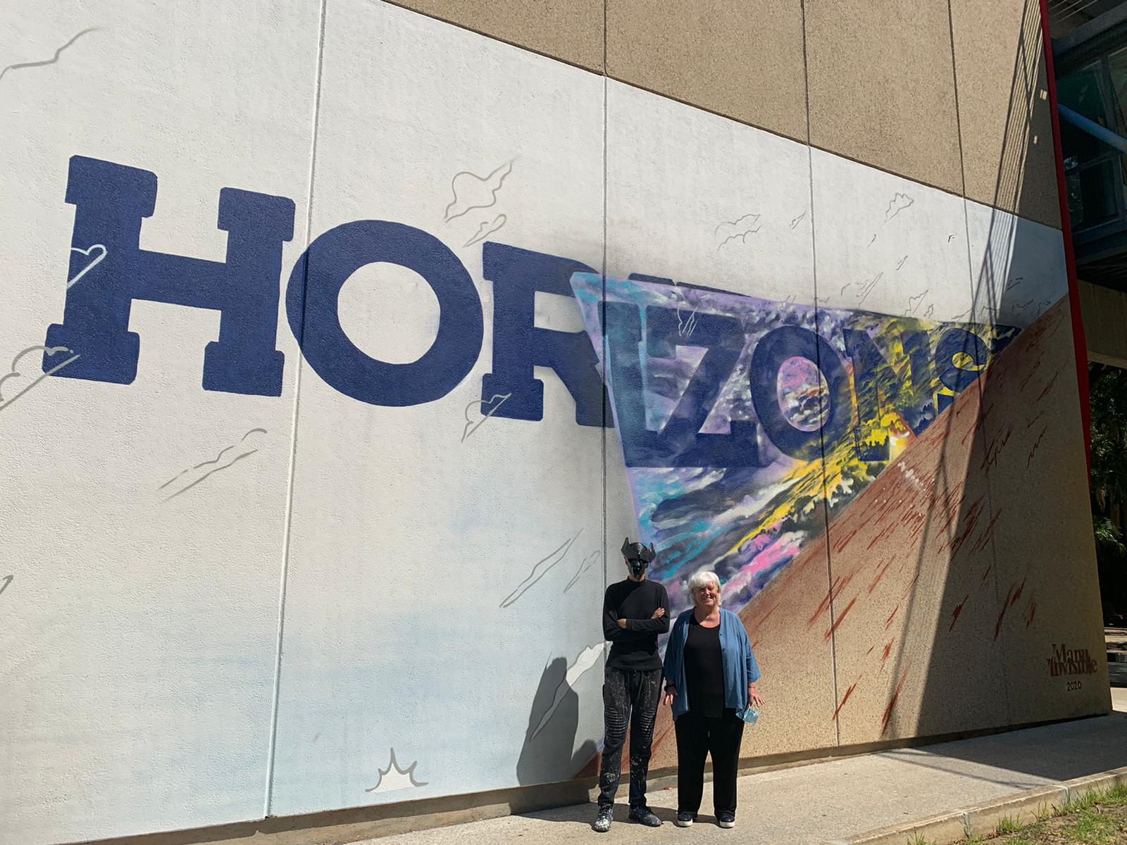 Un messaggio di speranza dell’artista, espresso in un foglio bianco disegnato su una parete, con un lembo che si solleva scoprendo la scritta “Horizons” e un arcobaleno: nuovi orizzonti e la lingua inglese utilizzata come apertura verso il mondo.