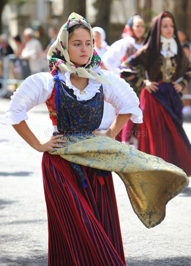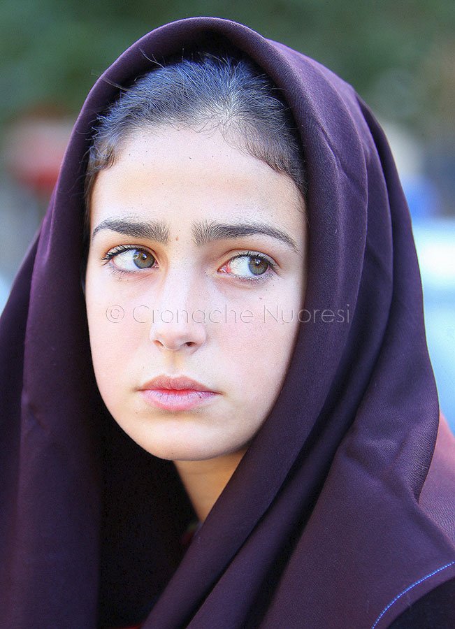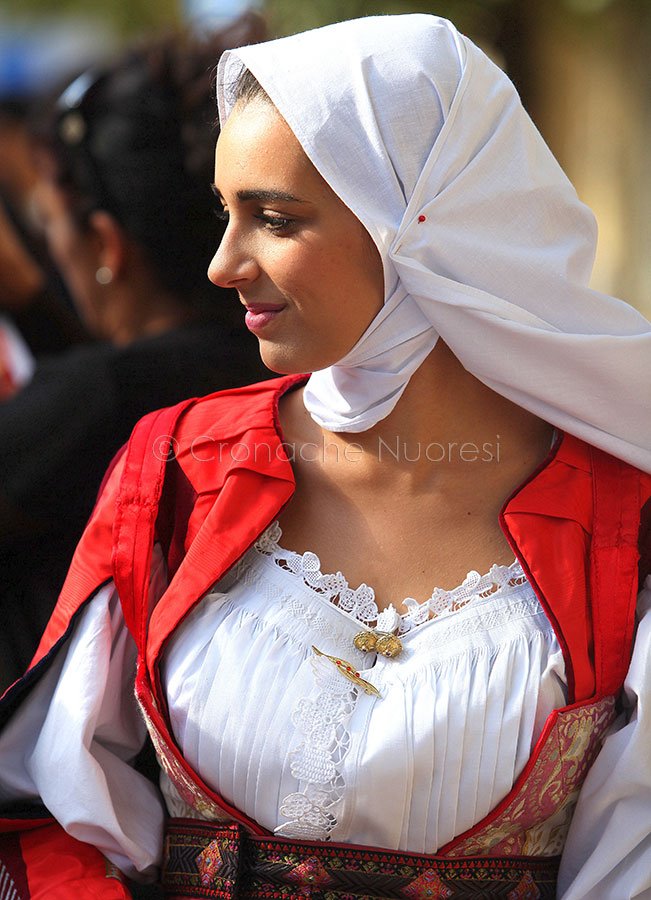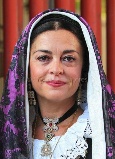 Fasciato da bende di seta, incorniciato da fazzoletti di raso, impreziosito da scialli finemente ricamati. È il volto della donna sarda, della donna in costume: non è un volto qualunque. Un volto che sa portare da sempre, o che ha imparato a farlo con gli anni, il peso della veste che indossa. In costume, le donne sarde, anche le più giovani, ridiventano per un momento, per qualche ora, per un giorno intero, la donna sarda per eccellenza. Fiera, sicura, moglie e madre generosa e fedele.