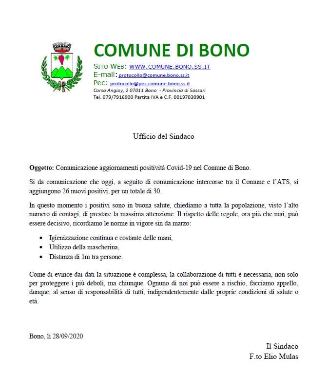 Nella giornata odierna a Bono sono stati rilevati dall’ATS Sardegna 26 nuovi casi di positività al Covid-19.