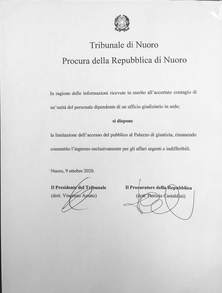 Un dipendente di un ufficio giudiziario del Tribunale di Nuoro è risultato positivo al Covid-19. Tutte le udienze previste per oggi, dunque, sono state rinviate alla prossima settimana.