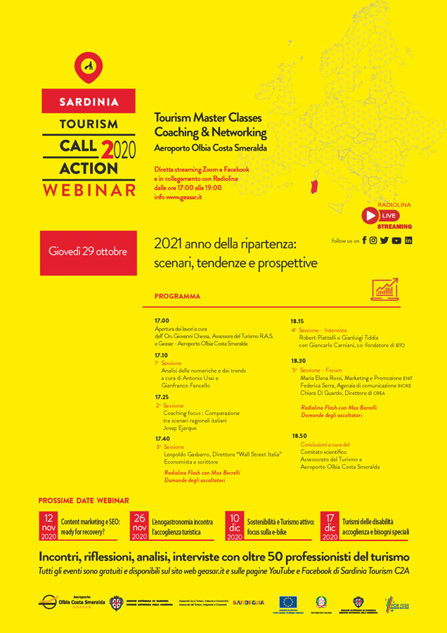 La Geasar, società di gestione dell’Aeroporto di Olbia, con la collaborazione dell’Assessorato del Turismo della Regione Sardegna ed il patrocinio di Enit e Tourism Plus, propone da ottobre a dicembre 2020, 4 appuntamenti all’interno del programma di promozione Workshop & Coaching, denominati “Tourism Master Classes Webinar- Seconda Edizione 2020”.
