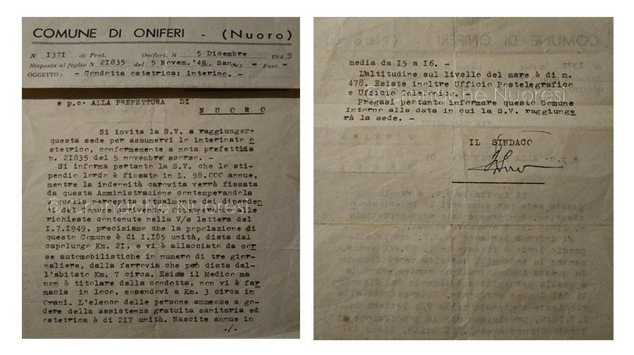 La figlia della signora Manetti, che oggi risiede a Orosei, dopo la commozione per aver letto il pezzo relativo alla nascita in casa del piccolo Luca ci ha contattato raccontandoci la storia della propria mamma, una storia iniziata il 5 dicembre 1949, quando il Comune di Oniferi invia la lettera d’incarico all’attenzione di Manetti Anna, conferendole la “Condotta ostetrica interino” e invitandola a “raggiungere questa sede per assumervi l’incarico” indicato…. “Si informa – si legge nella missiva – che lo stipendio lordo è fissato in 98,000 lire annue mentre la indennità carovita verrà fissata da questa amministrazione contemperandola a quella percepita attualmente dai dipendenti del Comune scrivente…”