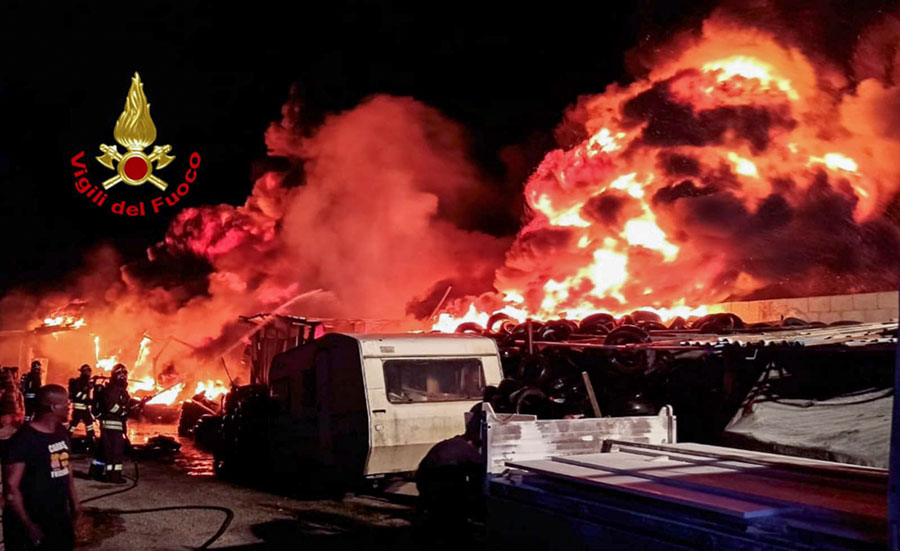 Sul posto sono accorsi in forze i Vigili del Fuoco che hanno dovuto lavorare a lungo prima di avere ragione delle fiamme e evitare che queste si propagassero ad altre attività e terreni adiacenti: all’interno dell’area coinvolta dal rogo, tra l’altro, c’erano vari automezzi in sosta. Per fortuna non si segnalano persone ferite.