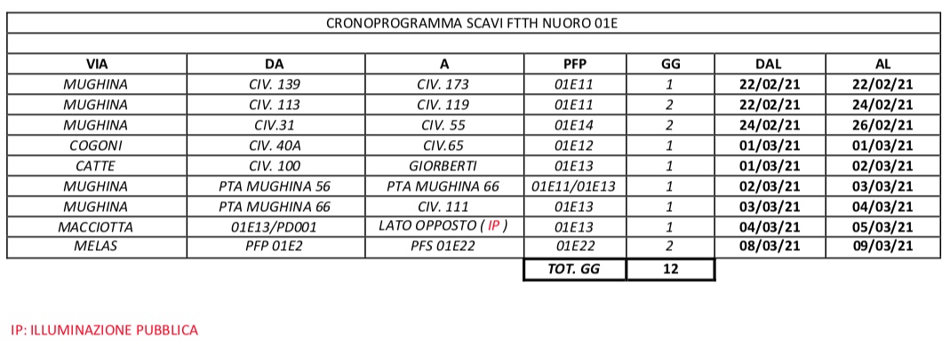 Sarà obbligo dell’impresa SiAT installazioni, esecutrice dei lavori per conto della ditta Open Fiber s.p.a. con sede a Milano in viale Certosa, di apporre, almeno 48 ore prima dell’inizio degli stessi, la segnaletica stradale temporanea di divieto di sosta e quella di cantiere, adottando gli opportuni accorgimenti necessari per la sicurezza e la fluidità della circolazione e mantenerli efficienti sia di giorno che di notte.