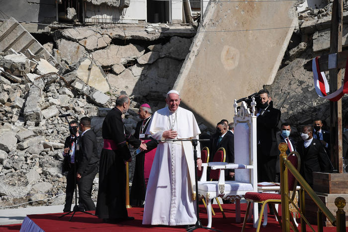 In precedenza a Mosul, nel nord dell’Iraq, il pontefice ha pregato per le vittime della guerra e dei conflitti armati. «Qui a Mosul le tragiche conseguenze della guerra e delle ostilità sono fin troppo evidenti. Com’è crudele che questo Paese, culla di civiltà, sia stato colpito da una tempesta così disumana, con antichi luoghi di culto distrutti e migliaia e migliaia di persone, musulmani, cristiani, yazidi che sono stati annientati dal terrorismo e altri sfollati con la forza o uccisi!. Oggi, malgrado tutto, riaffermiamo la nostra convinzione che la fraternità è più forte del fratricidio, che la speranza è più forte della morte, che la pace è più forte della guerra».