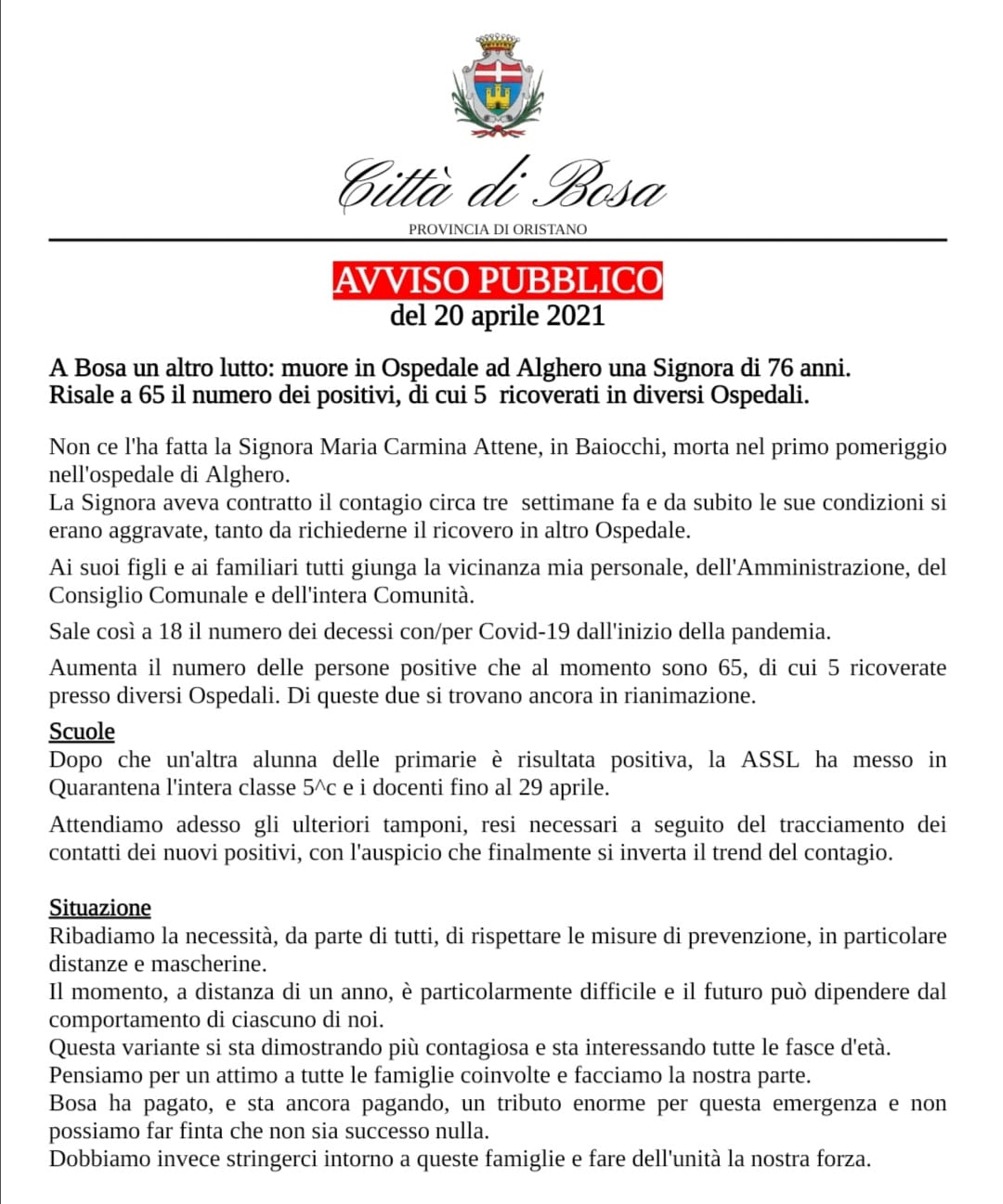 A darne notizia il sindaco Pier Franco Casula in una nota (LEGGI LA NOTA) in cui si ribadisce la necessità, da parte di tutti, “di rispettare le misure di prevenzione, in particolare distanze e mascherine. Il momento, a distanza di un anno, è particolarmente difficile e il futuro può dipendere dal comportamento di ciascuno di noi. Questa variante si sta dimostrando più contagiosa e sta interessando tutte le fasce d’età. Pensiamo per un attimo a tutte le famiglie coinvolte e facciamo la nostra parte. Bosa ha pagato, e sta ancora pagando, un tributo enorme per questa emergenza e non possiamo far finta che non sia successo nulla. Dobbiamo invece stringerci intorno a queste famiglie e fare dell’unità la nostra forza”.