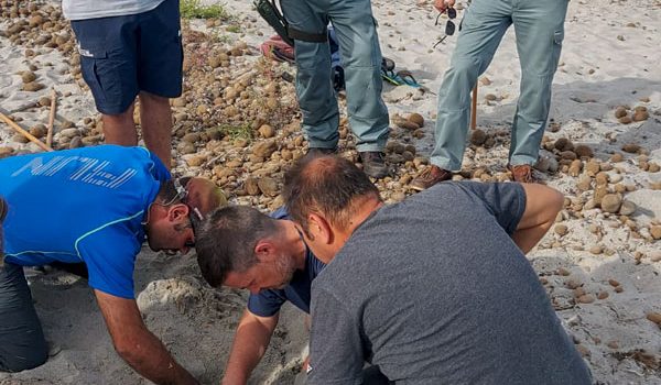 È stato un abitante del post a chiamare la Sala Operativa di Fenosu. Il Corpo Forestale ha immediatamente allertato i ricercatori del Centro di recupero CReS di Torregrande, intervenuti immediatamente insieme con il personale dell’AMP del Sinis e i veterinari della clinica Due Mari. Quando gli operatori sono arrivati sul posto la tartaruga marina stava già deponendo le uova per rirendere poi il largo verso la mezzanotte alla presenza dei ricercatori, del Sindaco di Arborea e di una pattuglia del Corpo Forestale della Stazione di Marrubiu che ha presidiato il nido tutta la notte. All’alba il nido è stato riaperto dal personale del CReS di Torregrande e le 98 uova sono state spostate in un’area più idonea in quanto la deposizione, avvenuta a pochi metri dalla battigia, non assicurava la riuscita della schiusa.
