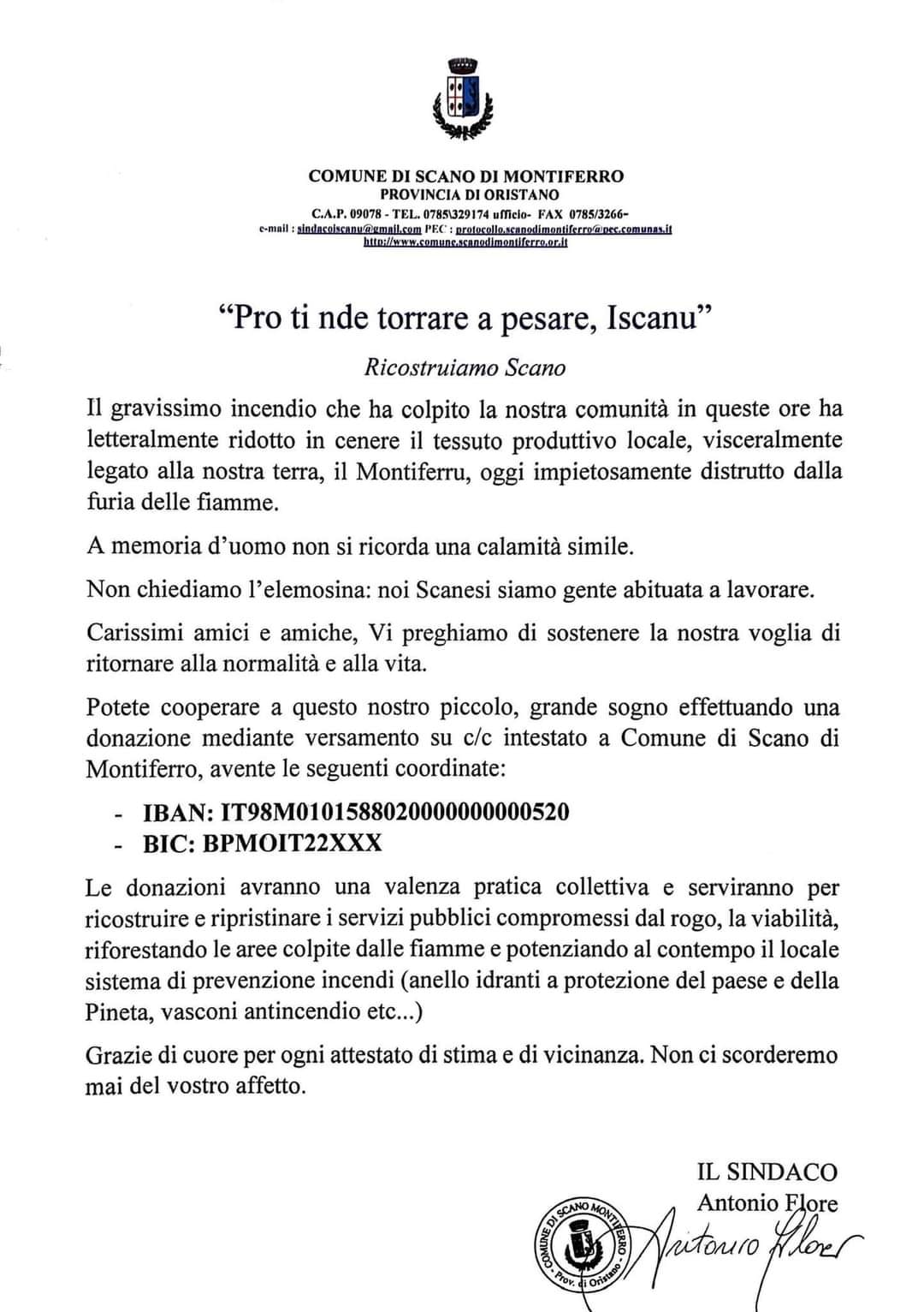 “Non chiediamo l’elemosina: noi Scanesi siamo gente abituata a lavorare. Carissimi amici e amiche, Vi preghiamo di sostenere la nostra voglia di ritornare alla normalità e alla vita. Potete cooperare a questo nostro piccolo, grande sogno effettuando una donazione mediante versamento su c/c intestato a Comune di Scano di Montiferro, avente le seguenti coordinate: IBAN: IT98M0101588020000000000520 – BIC: BPMOIT22XXX.