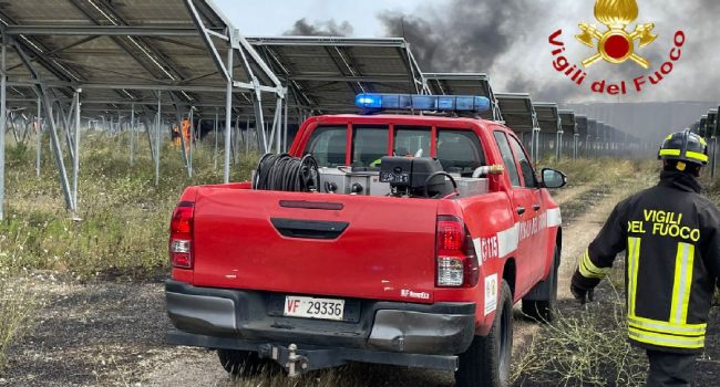 L’incendio generato da un problema tecnico, ha interessato oltre la vegetazione spontanea anche alcune stringhe di pannelli e i relativi quadri di comando.