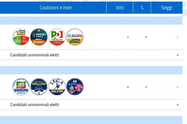 Secondo alcuni sondaggi coon una copertura del campione pari al 71% il Centrodestra sarebbe avanti alla Camera con una forchetta tra il 41,5 e il 45,5%. Centrosinistra dato al 25-29%. M5s 14-18%. Azione tra il 5 e il 9%. Italexit tra 1,5 e 3,5%. Tra i singoli partiti FdI 22,5-26,5%, Lega 8,5-12%, Forza Italia 5-9%, Pd 17-21% 8 (fonte tgcom24).
