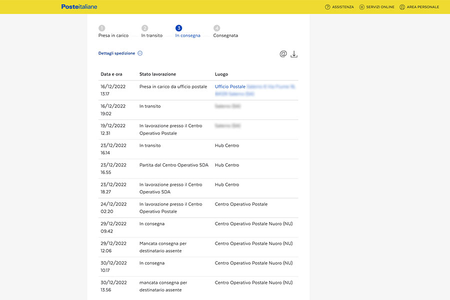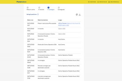 Esempio di tracking di Poste Italiane al 6 gennaio 2023