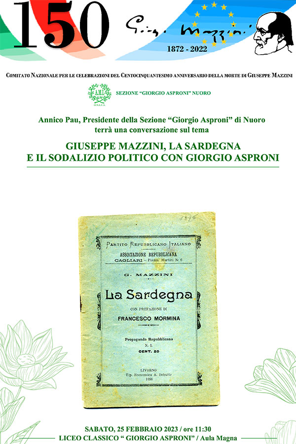 Nel quadro delle manifestazioni per la celebrazione del centocinquantesimo della morte di Giuseppe Mazzini, l’Associazione Mazziniana di Nuoro “Giorgio Asproni” ha organizzato per oggi, sabato 25 febbraio, a partire dalle 11,30 un incontro di studio presso l’aula magna del Liceo Classico Asproni.