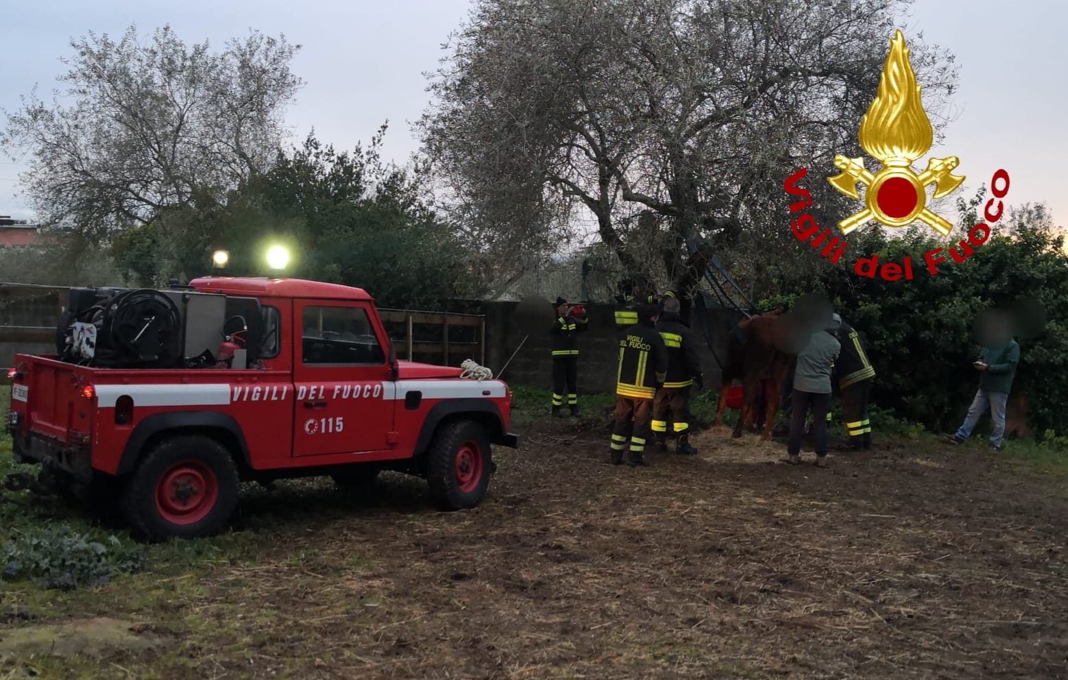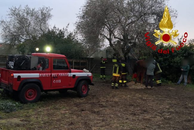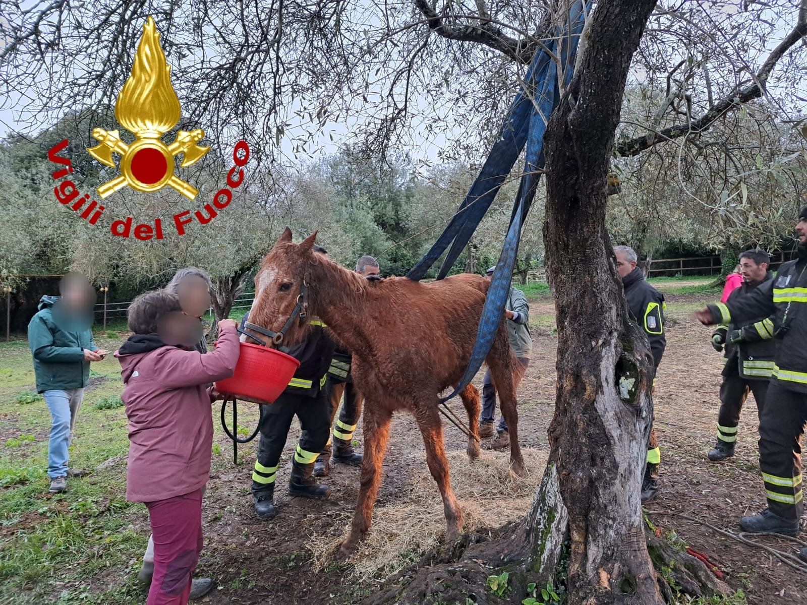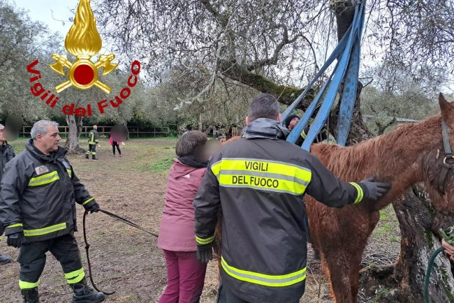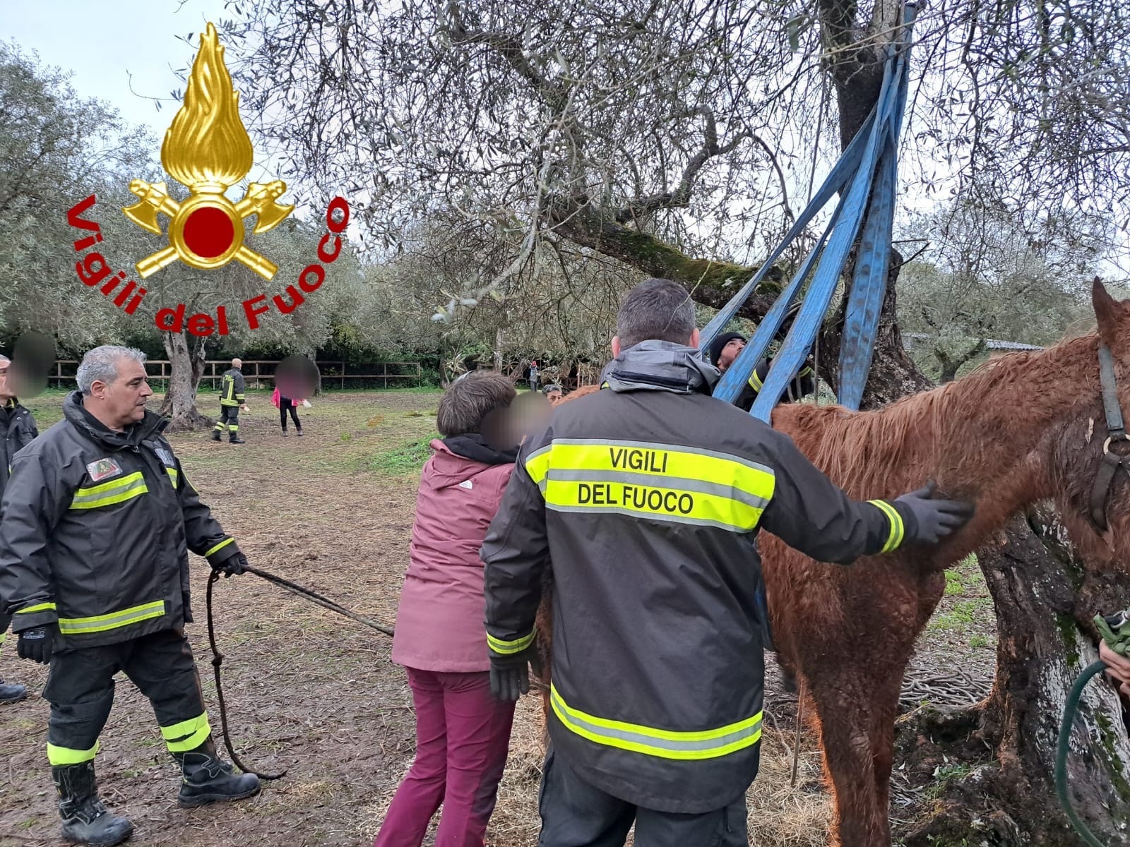 Scattato l’allarme, è intervenuta una squadra dei Vigili del Fuoco del locale comando provinciale che, alla presenza di 2 veterinari, ha provveduto a rimettere in piedi l’equino, sollevandolo prima a braccia e poi servendosi di un fuoristrada munito di verricello e di alcune fasce, facendo leva su un albero, e portarlo in salvo.