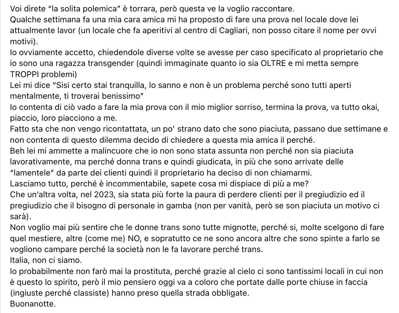 Era stata scartata dal lavoro in un locale del centro di Cagliari perché transgender e aveva denunciato sui social l’episodio di discriminazione. Adesso, però, per Martina Floris, 21 anni di Cagliari, sono arrivate due opportunità lavorative: un contratto stagionale in uno dei chioschi sulla spiaggia del Poetto e un tirocinio in un bar di via Dante, sempre a Cagliari.