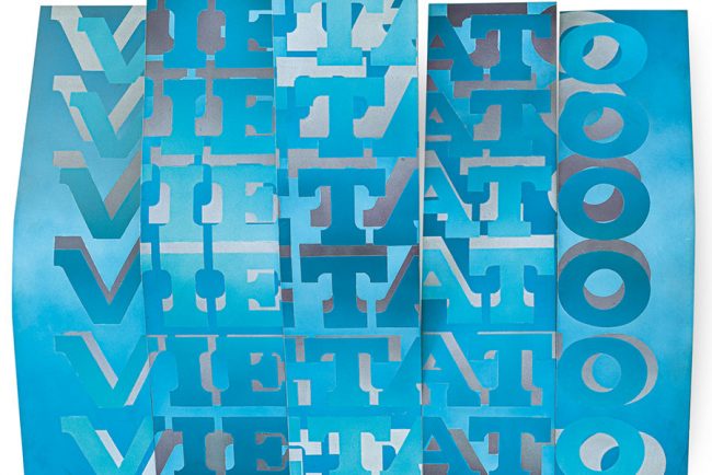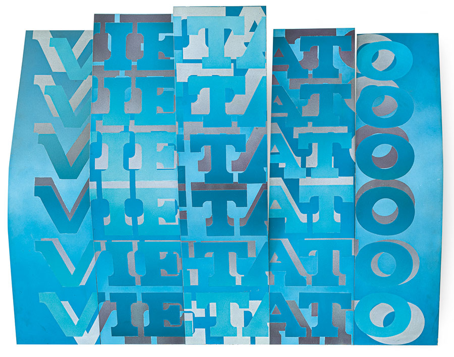 L’allestimento propone un percorso che ha inizio con il deciso passaggio all’astrazione di metà anni Sessanta (Spazi e Transazioni), successivamente ampliata con l’utilizzo di tecniche e materiali sperimentali quali vernici nitroacriliche, feltro, specchi, carte adesive, ondolux e plexiglass (Nitroacrilici, degli anni Sessanta, Vietato, degli anni Settanta).