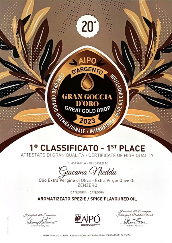 PREMI. Olio all’aroma di peperoncino, allo zenzero o a un grande classico del Nuorese, la pompia. Sono le produzioni di maggior successo dell’azienda Nieddu che arrivano dalle colline della catena del Marghine dove nascono gli oli che hanno conquistato le giurie di importanti kermesse del settore. A partire dalla ‘Gran Goccia d’Oro’ portata a casa da Terracuza con il primo posto al premio Aipo 2023 (categoria aromatizzato spezie), il 20° concorso oleario internazionale che rappresenta la filiera olearia italiana stimolando il confronto tra aziende nazionali e del bacino del Mediterraneo. Ma nelle scorse settimane l’azienda Nieddu aveva potuto fregiarsi anche della menzione di merito “Giovane imprenditore” assegnata ai migliori titolari under 40 al premio Ercole Olivario dedicato alle eccellenze olearie italiane. Non ultimo il riconoscimento legato alla selezione alla partecipazione al concorso Leone d’Oro entrando a far parte così alla selezione dei migliori oli extravergini del mondo.