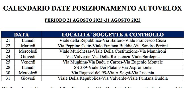 Che l’autovelox a Nuoro scatta il 21 agosto ormai è un fatto assodato. Con oggi invece il cerchio si chiude con la pubblicazione del posizionamento delle apparecchiature dal 21 al 31 agosto nelle diverse vie cittadine.