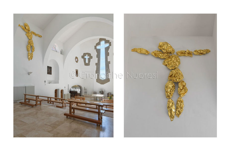 In questo straordinario contesto, sobrio ma ricco di significati simbolici, è stato recentemente collocato un suggestivo crocifisso. L’opera d’arte sacra: “Fractalis Passion. Simulacrum Sacrarium”, imponente nelle dimensioni e allo stesso tempo delicata e leggera nella sua struttura, è stata creata da Tiziana Lorenzelli e donata alle monache che risiedono nel monastero di clausura. La designer e artista ha avuto modo di confrontarsi e di apprendere dall’estro di Couëlle e questo suo intervento è un omaggio poetico alla carismatica figura dell’architetto francese. In questa chiesa, dove l’architettura e l’arte si fondono, il crocifisso di Tiziana Lorenzelli è un messaggero di luce e spiritualità, un legame tra il passato e il presente, un invito a contemplare ciò che va oltre, nella continua ricerca di armonia e trascendenza. L’immagine del Cristo sulla croce è solo accennata con essenzialità dai volumi anatomici, modellati con una sottile lamina, secondo un processo chiamato “alufexia“, che costituisce una peculiare cifra stilistica di Tiziana Lorenzelli.