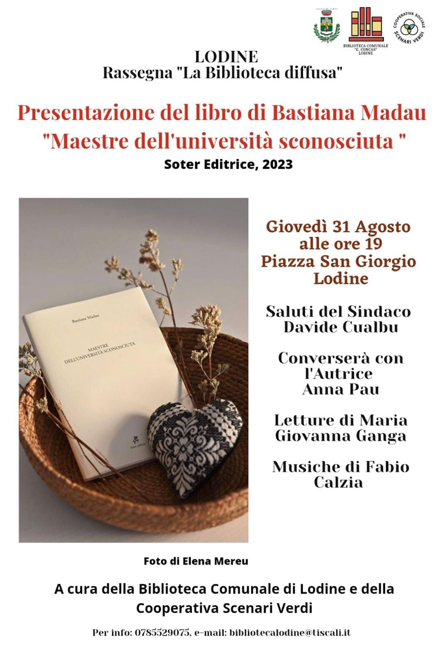 Nell’ambito della rassegna “La biblioteca diffusa”, giovedì 31 agosto, alle 19, a Lodine, nella suggestiva piazza San Giorgio, si terrà la presentazione dell’ultimo libro di Bastiana Madau Maestre dell’università sconosciuta (Soter Editrice, 2023). Dopo i saluti del Sindaco Davide Cualbu, dialogherà con l’autrice Anna Pau; con le letture di Maria Giovanna Ganga e le musiche di Fabio Calzia. L’evento è organizzato dalla Biblioteca Comunale di Lodine e dalla Cooperativa Scenari Verdi.