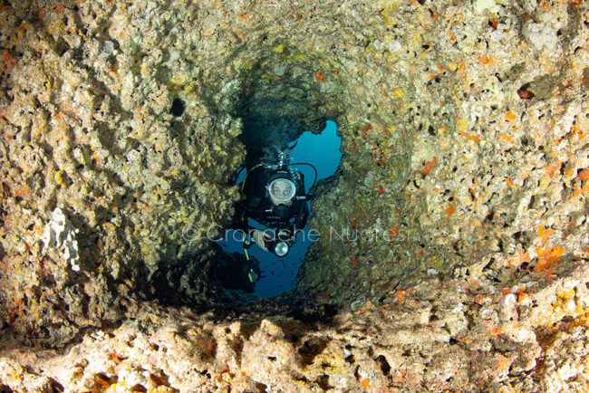 LA COSTA DI ALGHERO – Nella costa di Alghero le immersioni vengono effettuate soprattutto a Nord, tra l’area marina protetta di Capo Caccia e Punta Giglio. Sono immersioni molto tecniche che si effettuano soprattutto nelle grotte sottomarine. Il percorso più suggestivo di solito si effettua nella Grotta di Nereo, caratterizzata da grandi archi con una profondità massima di circa 20 metri e con un ingresso che si sviluppa a circa 30/32 metri sott’acqua. La parte più suggestiva è rappresentata da un cunicolo che si sviluppa all’interno della montagna, molto ampio ma anche molto esteso in lunghezza: vi si può addentrare per circa 150 metri. Al suo interno sono presenti dei sifoni d’aria che consentono la riemersione. Questo angolo incantevole di Sardegna, che si affaccia su un promontorio, offre paesaggi mozzafiato e immersioni suggestive che si snodano tra grotte marine che sono un unicum nel mediterraneo. Questo tratto costiero offre la possibilità ad appassionati subacquei, esperti e non, di vivere emozionanti incontri con molteplici forme di vita dai colori intensi, tipicamente mediterranei. La peculiarità di questi luoghi è infatti la presenza di innumerevoli grotte tappezzate da dense fioriture di coralli che nelle parti più ombrose sfociano nel prezioso colore rosso, e poi enormi cerianthus, diverse varietà di pescie e di crostacei completano l’habitat di questi incredibili ambienti. In un unico itinerario si possono incontrare varie speci ittiche: corvine, dentici, barracuda, saraghi, murene, gronghi, mustelle, cernie, aragoste, cicale e enormi astici. Alcune grotte sono poco impegnative, con ampi ingressi e grandi passaggi a tunnel molto articolati, altre con lunghi e tortuosi cunicoli, sono però riservate ai più esperti subacquei ed agli speleosub attrezzati.