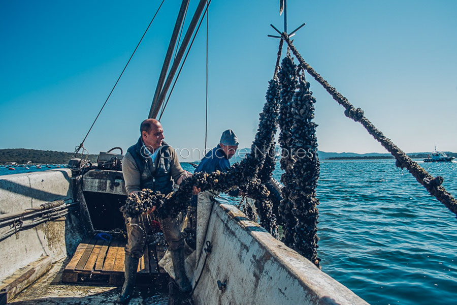 Le Ostriche – Allevata nel Golfo sin dagli anni ’20 del secolo scorso, dopo varie interruzioni, da un decennio l’Ostrica (crassostrea gigas) è nuovamente disponibile con le sue caratteristiche uniche di sapore e gusto. La lavorazione in lanterna ne consente una varia scelta per pezzatura, con quella ottimale di 12 pz/kg.. L’allevamento è in sospensione e ripartito per filari. Il processo di lavorazione dell’ostrica è più complesso rispetto a quello delle cozze. Una volta inserite all’interno di sacche dette “poches” sono depositate dentro le lanterne, per consentire lo sviluppo di una conformazione regolare del mollusco che non deve superare un centimetro, l’ostrica non può stare durante tutto il processo di sviluppo immersa in acqua quindi le sacche vanno rovesciate in modo tale che ci sia un contatto anche con l’aria. Questo processo ovviamente anche in Sardegna ha subito degli importanti segnali di modernizzazione che hanno consentito uno sviluppo meccanico in quelli che una volta erano dei procedimenti manuali.