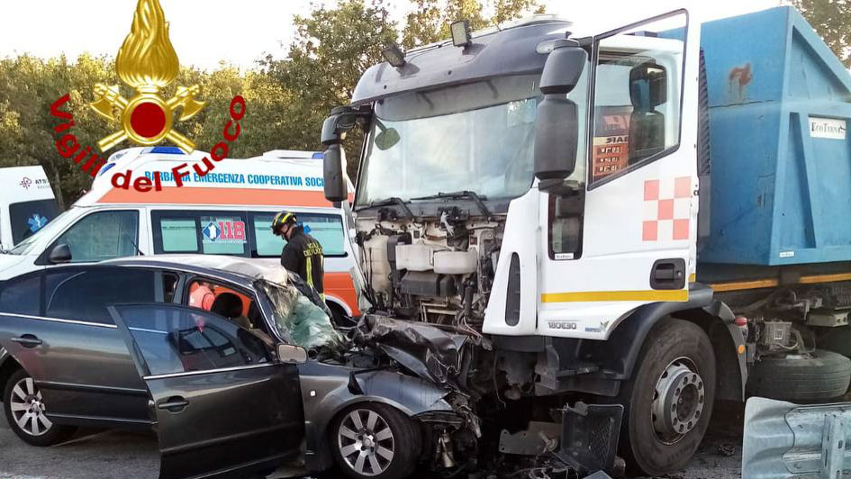 L’auto ha impattato violentemente contro l’autoarticolato che viaggiava in direzione opposta: arrivata sul posto la squadra dei Vigili del Fuoco ha subito iniziato le operazioni per estrarre dalle lamiere i due occupanti dell’auto.