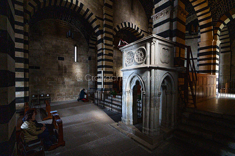 LA FABBRICA DELLA CATTEDRALE – La fabbrica per la costruzione della cattedrale fu aperta alla metà del XII secolo ma il cantiere fu abbandonato quando erano stati edificati solo una parte dei muri perimetrali e definita la pianta, ripartita su tre navate; l’opera fu poi portata a compimento tra il 1170 e il 1190. Lo stile dell’edificio ecclesiale è di gusto squisitamente romanico, con influenze pisano-pistoiesi ma anche francesi, una pluralità di sfumature che è anche il segno che i suoi artefici dovettero mediare non poco col mutare degli stili avvenuto nelle due fasi edificatorie per raccordare parti originarie dell’apparato murario, sviluppo dell’elevato e prospetto.