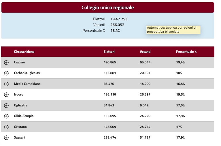 In termini assoluti sono andati ai seggi 266.052 votanti su 1.447.753 elettori. Nella sola città di Cagliari, ha votato il 20,51% degli aventi diritto. Nel 2019 il dato definitivo dell’affluenza era stato del 53,77%, in termini assoluti avevano votato 790.709 elettori su 1.470.401 aventi diritto. Nel Nuorese ha votato il 19,5% degli elettori (nel dettaglio a Nuoro si sono recati al seggio su 30.073 aventi diritto al voto 7.520 corrispondenti al 25% dei cittadini)
