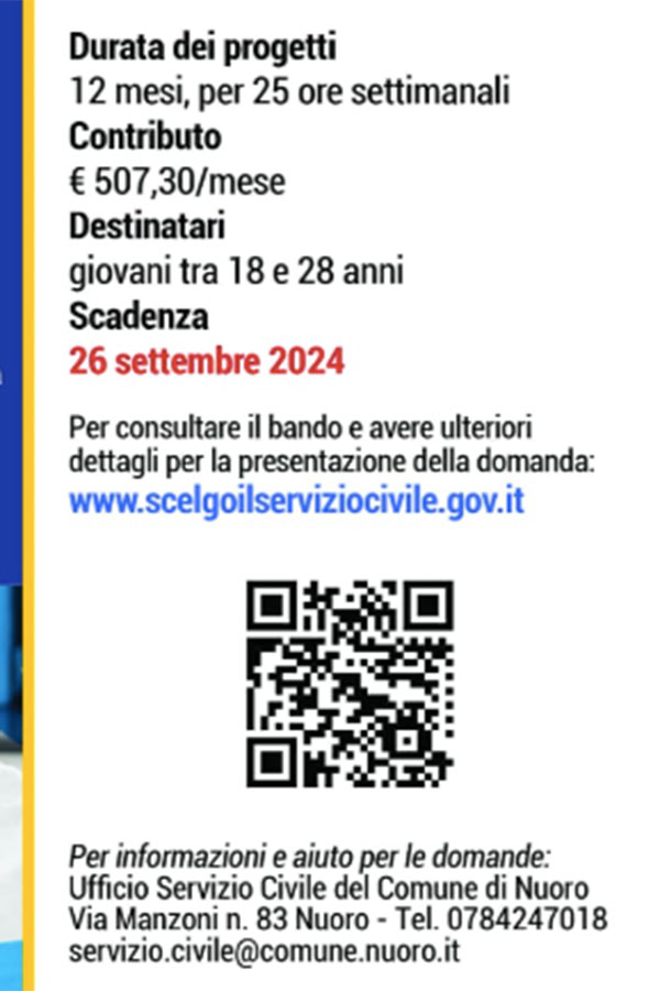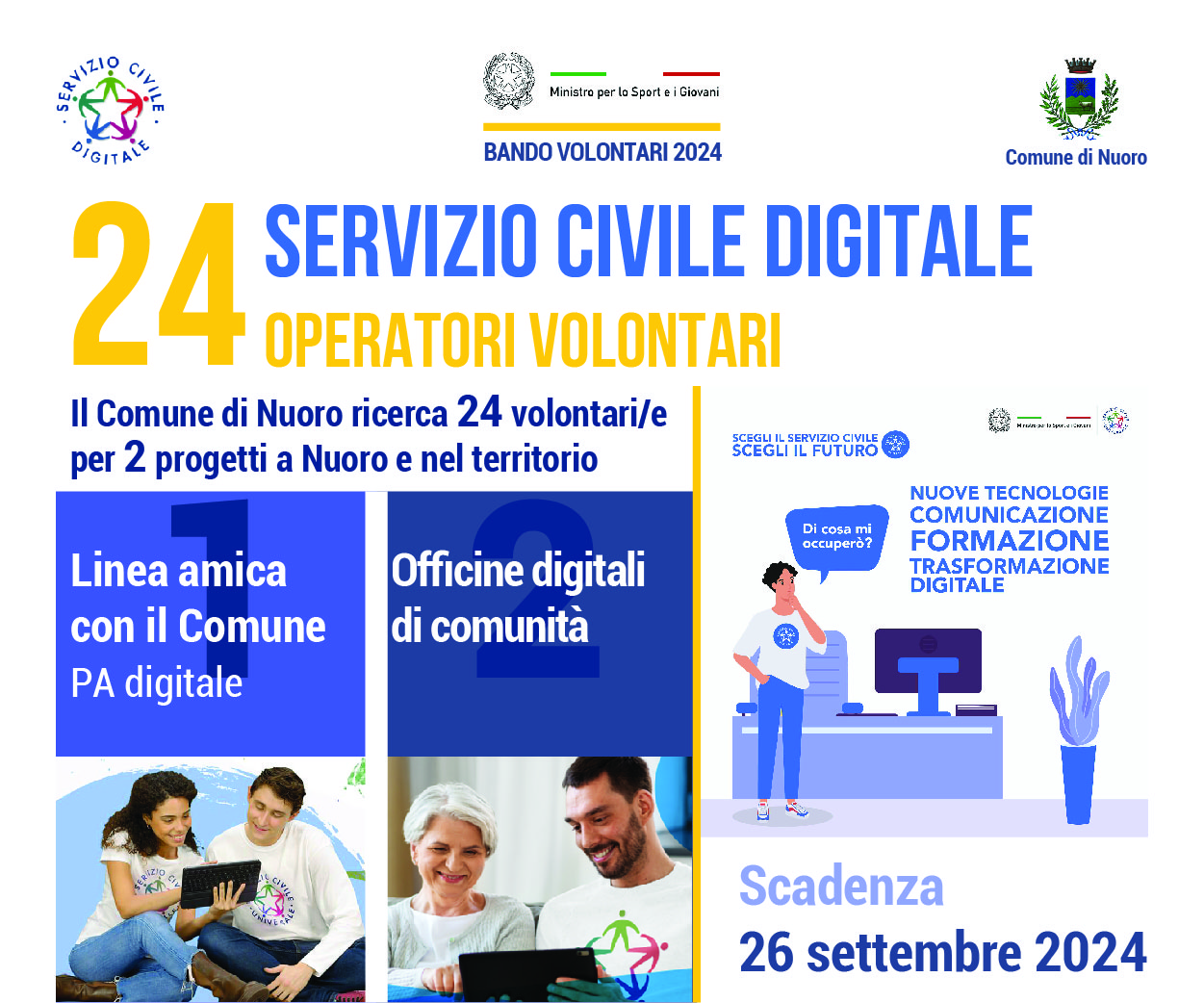 NUORO – Il Comune di Nuoro sta cercando 24 operatori volontari che operino per un anno nell’ambito del servizio civile digitale per due progetti in città e nel territorio.