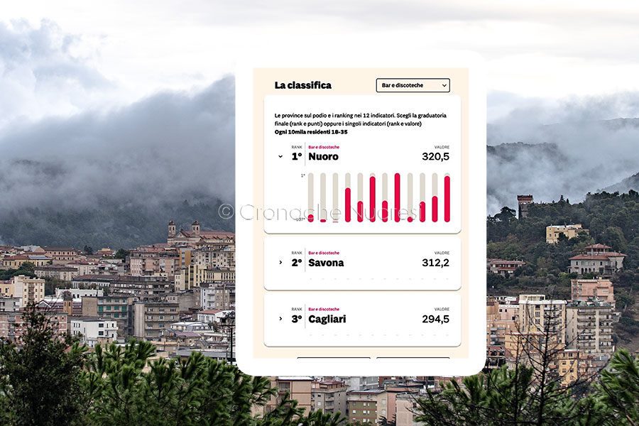 Nuoro eccelle nella sezione “Bar e discoteche”, piazzandosi al primo posto a livello nazionale con un punteggio di 320,5 ogni 10mila abitanti rispetto alla media nazionale seguita dalle province di Savona e Cagliari. La contraddizione è evidente: da un lato, la Provincia pullula di locali, dall’altro fatica a garantire servizi essenziali e un ambiente di vita soddisfacente. Cresce anche la voglia di fare impresa, con la provincia che si posiziona all’ottavo posto a livello nazionale.