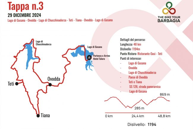 Domenica 29 dicembre l’ultima tappa, di 48 chilometri e con un dislivello di 1194 metri, chiuderà la prima edizione del Bike Tour Barbagia. Stavolta, sempre con partenza alle 10 dal Lago di Gusana, ci si dirigerà verso Ovodda passando per la panoramica Statale 128, poi si visiterà lo splendido Lago di Chucchunadorza e si raggiungerà Teti, noto per gli imperdibili siti nuragici. Attraverso i paesaggi selvaggi della Provinciale 60, si arriverà poi a Tiana, da cui, dopo una pausa, si tornerà a Ovodda e all’Hotel Taloro per la chiusura dello spettacolare viaggio alla scoperta delle meraviglie della Barbagia.