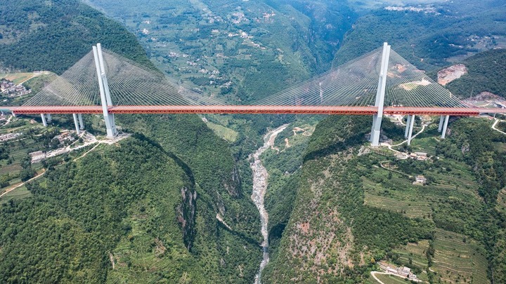Progetto della Guizhou Transportation Investment Group Co, Ltd., il ponte sospeso ha un’altezza verticale di 625 metri dalla piattaforma alla superficie del fiume, circa il doppio dell’altezza della Torre Eiffel.