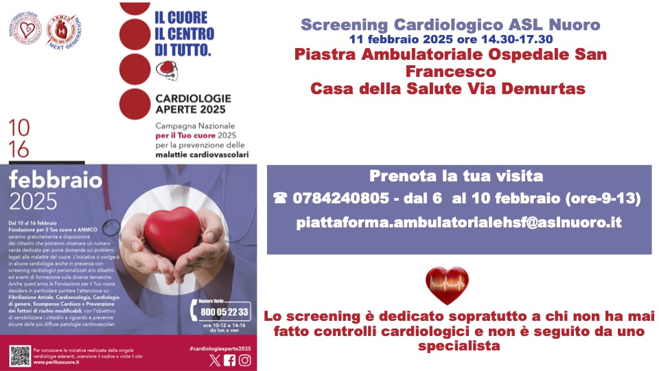 Aderendo all’iniziativa è possibile avere l’opportunità concreta ai cittadini di prendersi cura della propria salute cardiovascolare attraverso screening gratuiti. Martedì 11 febbraio, dalle 14.30 alle 17.30, sarà possibile sottoporsi a un elettrocardiogramma ed ecocardiogramma gratuiti presso gli ambulatori della Casa della Comunità San Francesco (ingresso da via Brigata Sassari) e della Piastra Ambulatoriale dell’Ospedale San Francesco. Sono disponibili circa 60 slot di prenotazione, di cui 45 presso la Piastra Ambulatoriale del San Francesco.