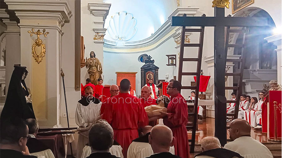 VENERDÌ SANTO: S’ISCRAVAMENTU E S’INTERRU, IL CULMINE DEL DOLORE – Il Venerdì Santo è il giorno del lutto per la morte di Cristo, segnato da due momenti rituali centrali: s’Icravamentu (la deposizione dalla croce) e s’Intzerru (il corteo funebre), entrambi curati dalla Confraternita di Santa Croce. Il priore invita ufficialmente le altre confraternite a partecipare, trasportando il Cristo Morto e la Madonna Addolorata. Anche s’Iscravamentu, come la processione dei Misteri, è stato recentemente ripristinato, e le sue fasi (la rimozione della corona di spine, l’estrazione dei chiodi) sono accompagnate da canti sacri come lo Stabat Mater, il Kirie e le Sette ispadas de dolore. Segue la processione de s’Interru de Zesu Gristu, guidata dal priore del Rosario. Il Cristo velato, deposto su una lettiga riccamente ornata (su brossolu), è portato in processione dai confratelli di Sas Ànimas, insieme agli strumenti della Passione. Al centro del corteo, i confratelli di Santa Rughe portano la grande croce scura (Sa Rughe Manna), mentre l’Addolorata è portata dai confratelli del Rosario. Una folla silenziosa e commossa chiude il corteo, recitando il Rosario e ascoltando i cantori intonare strofe del Miserere e sos gotzos de s’Interru ad ogni stazione. Al termine, i simulacri ritornano all’Oratorio di Santa Croce, dove un singolo cantore intona una toccante monodia sul dialogo tra Gesù e il peccatore.