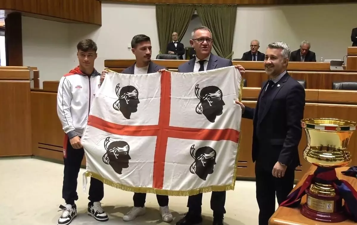 Ha preso la parola anche il capitano della squadra, Alessandro Vinciguerra: “Per noi è un onore, dimostra quanto la Sardegna è sempre unita. Noi ora realizziamo di aver raggiunto una cosa grande. La Sardegna merita dei trofei anche più grandi di questi. Rappresentiamo un’isola e questo ci da la forza per dare ancora di più in campo”. La cerimonia si è conclusa con la consegna da parte del presidente Comandini di una targa e della bandiera dei Quattro Mori: “Grazie da tutti noi – ha concluso – il gioco di squadra è sempre una politica vincente”.